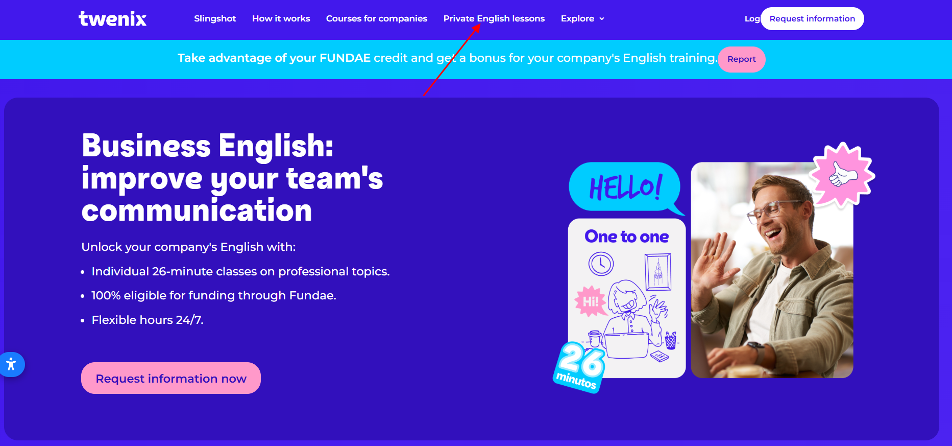 - Access our platform through https://www.twenix.com/ and select the "Private English lessons" option at the top of the screen.