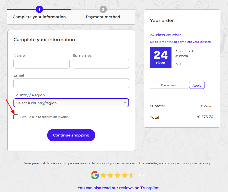 - If you wish to invoice the purchase in your company’s name, click the box "I would like to receive an invoice" and fill in the required fields.