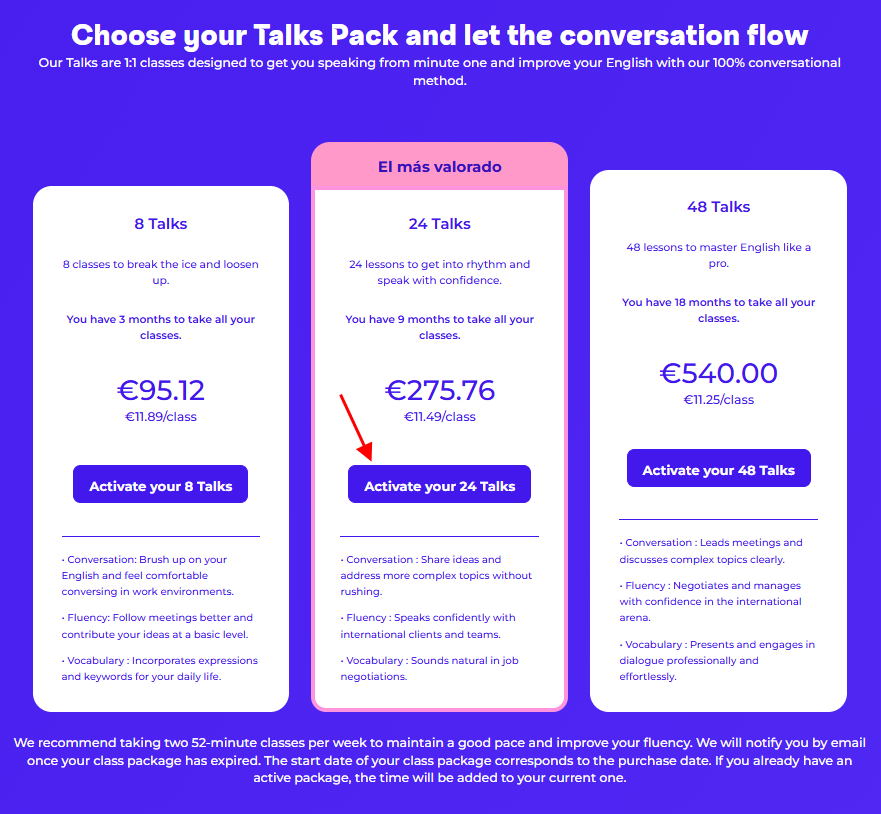 - Scroll down to see the different packs available. Choose the one that suits you best and click the "Activate your X Talks" button to start your educational adventure.