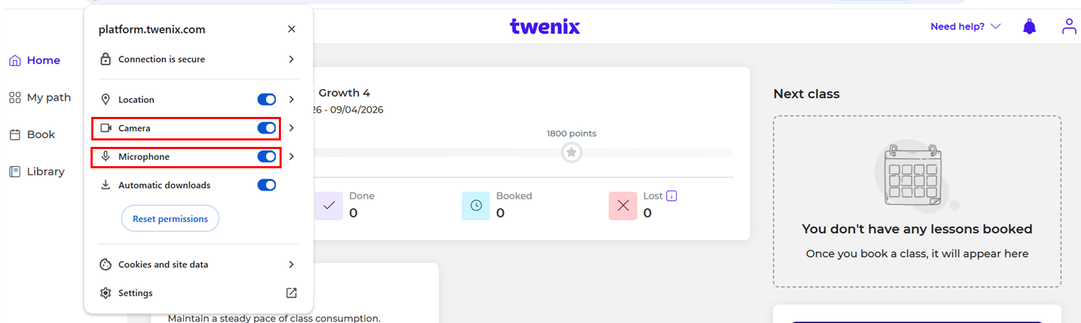 Make sure that the camera and microphone permissions are set to “Allow.”