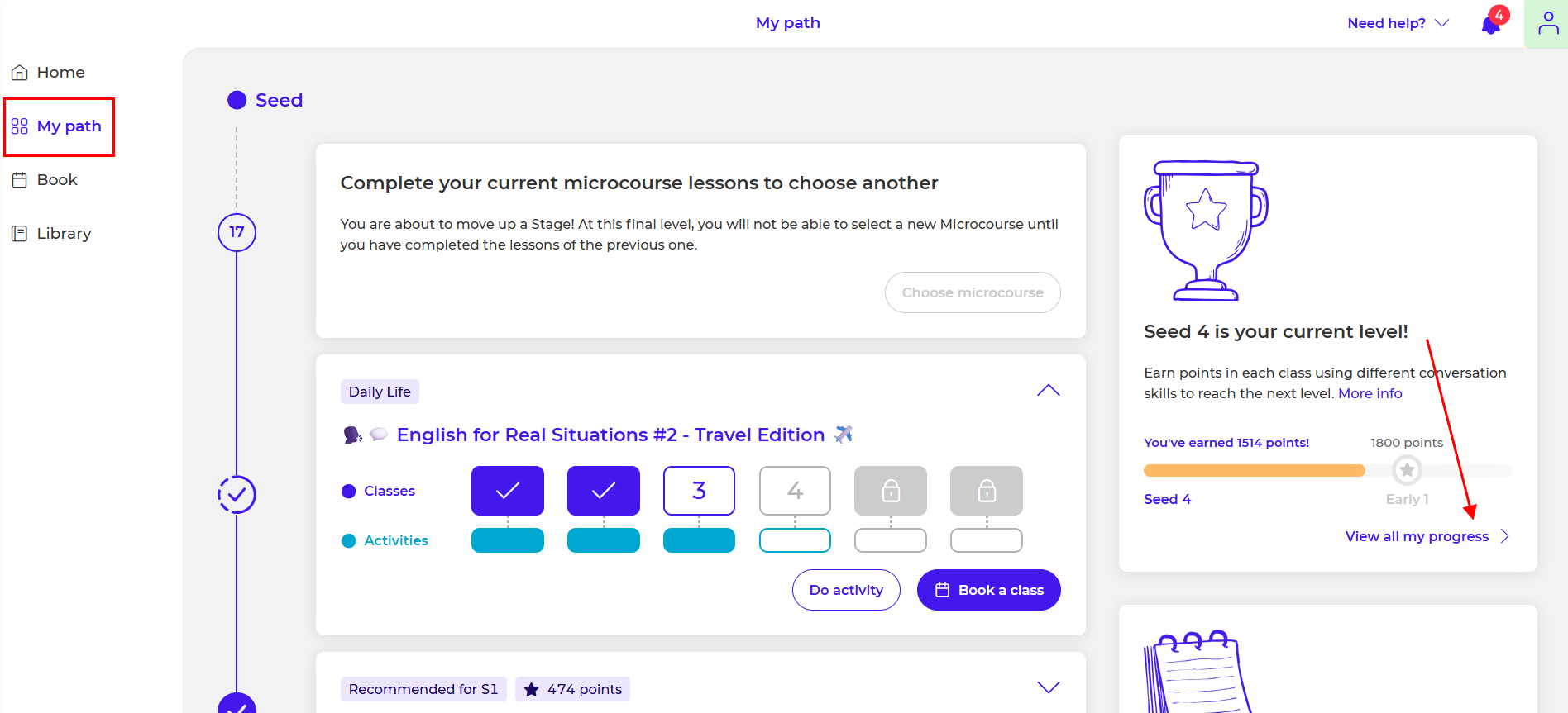 4️⃣ In the same section, you can review all the microcourses you have completed during the previous levels, as well as the points you have obtained in each of them.