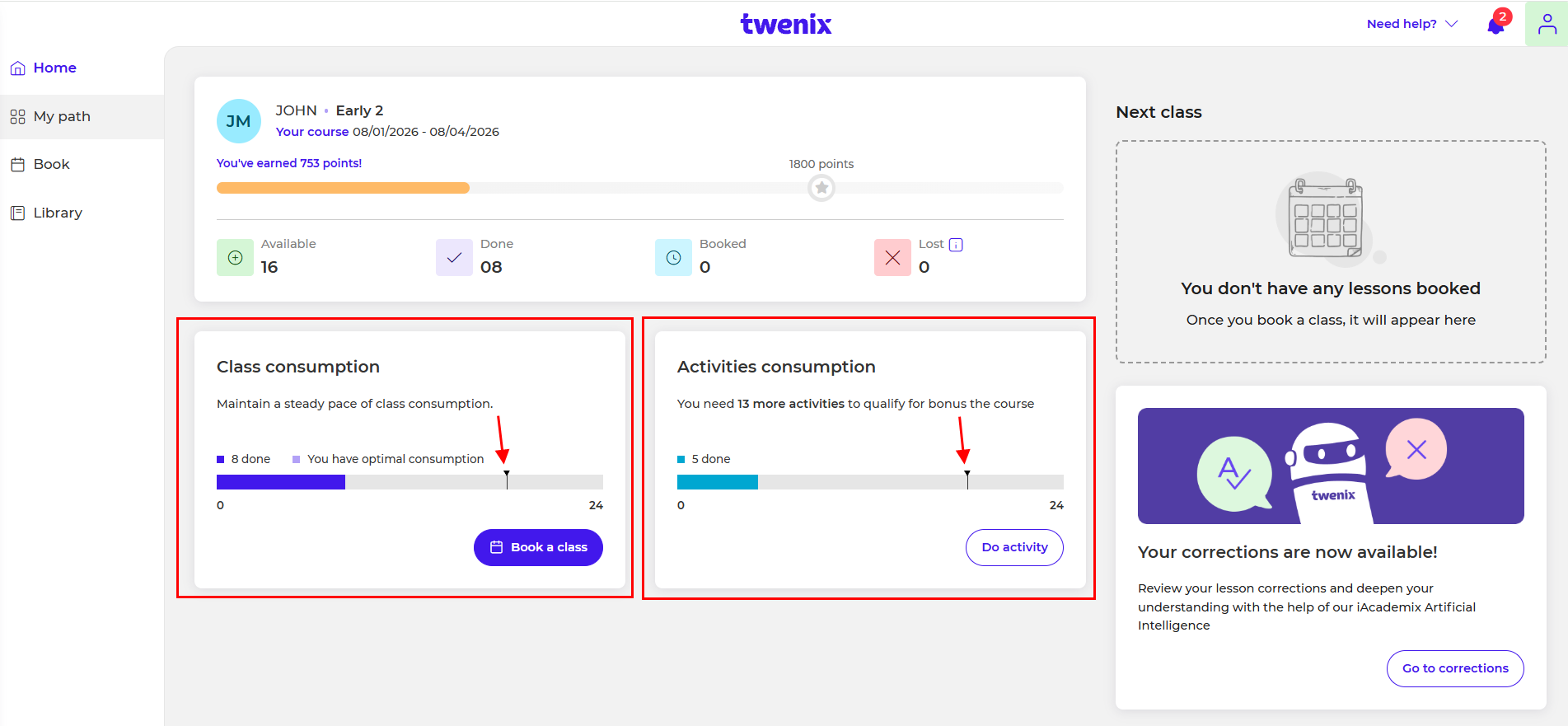 You can check your progress (classes and completed activities) in the "Home" section: