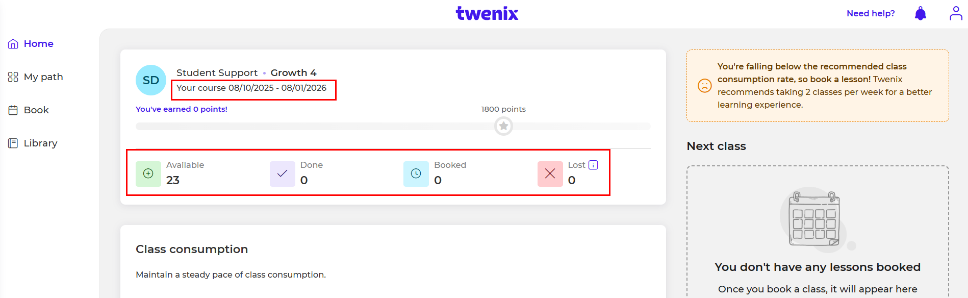 **The course end date shown in your account is included. You will be able to attend conversation classes and complete activities until midnight on the indicated date.