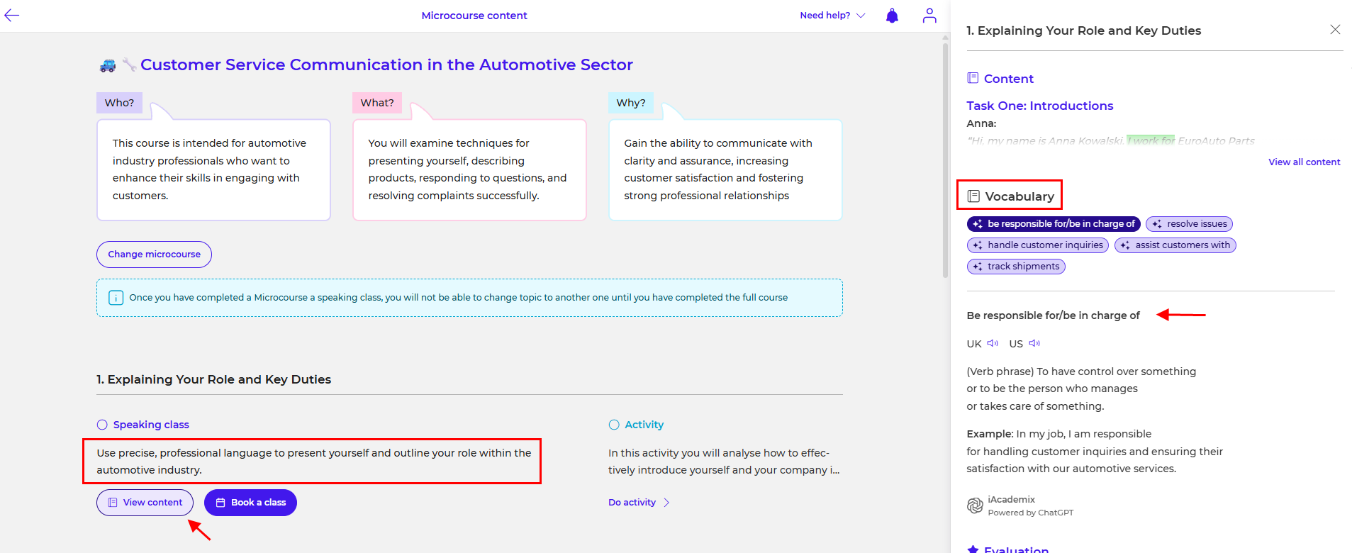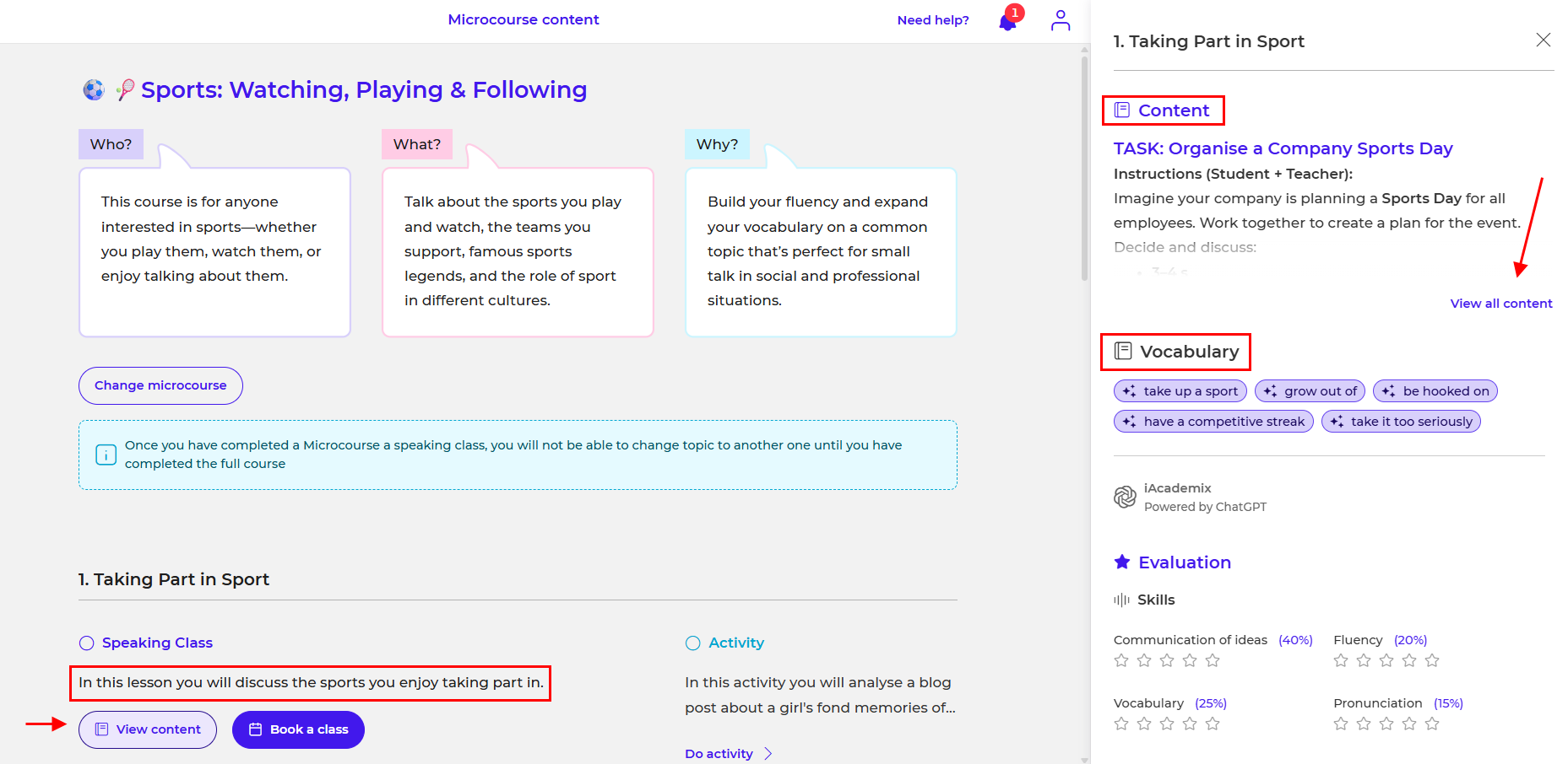 - Content: A description of the class topic that will help you understand the subject of the conversation and what will be discussed with your teacher.