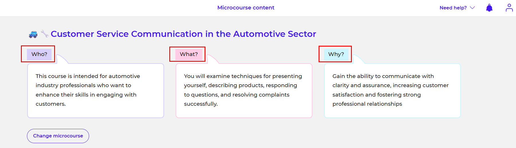 In the "Who? - What? - Why?" section of the selected microcourse, you can read the objective and general purpose of the entire microcourse and all its 6 classes: