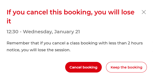 If you try to cancel a class with less than two hours' notice, you will see a pop-up message reminding you that if you continue with the cancellation process, the class will be considered lost.