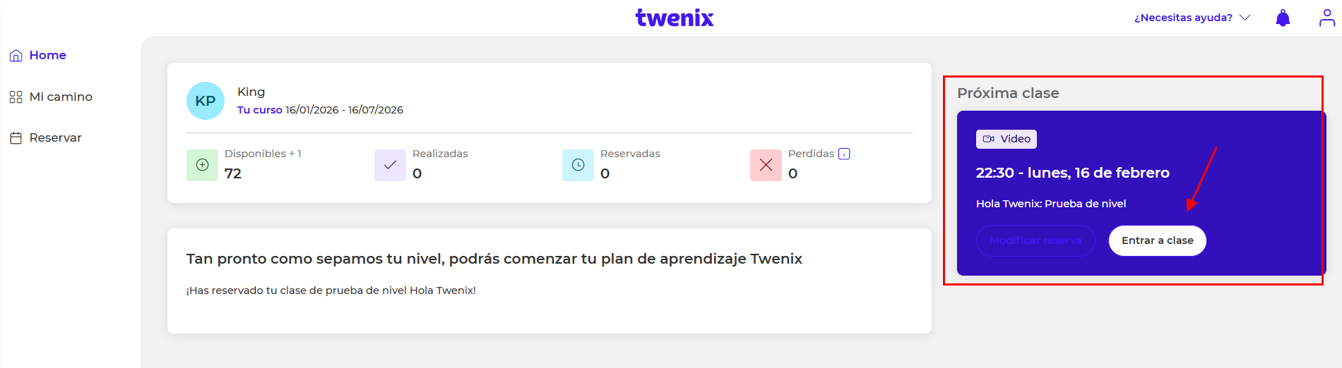 - En el apartado "Home" (sección "Próxima sesión"), encontrarás el botón "Entrar a clase" que te permitirà acceder directamente a tu clase a la hora de inicio prestablecida.