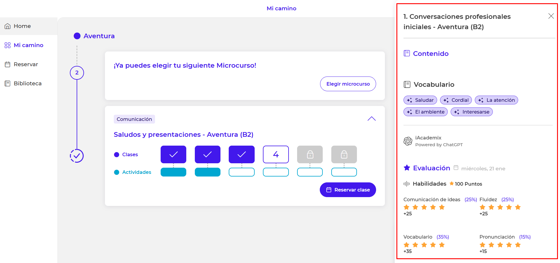 - En la parte derecha de tu pantalla, se abrirá una ventana con todos los detalles de la clase: el contenido abordado, los comentarios, la puntuación obtenida y las correcciones compartidas en el chat de la clase.