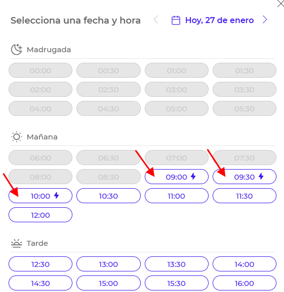 Con nuestra opción de reservas "de última hora" (las identificarás en el calendario por el rayo⚡), puedes agendar clases desde los 15 minutos hasta las 2 horas antes de su inicio. Es perfecta para estudiantes que buscan máxima flexibilidad en sus horarios y asistencia a las clases.