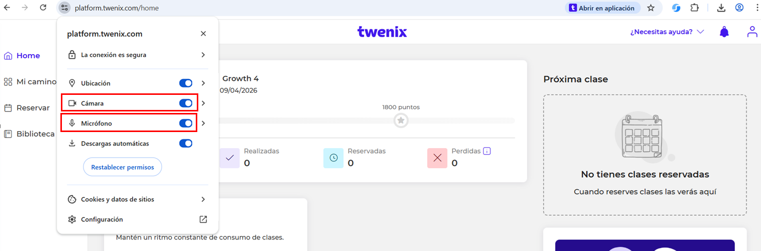 Asegúrate de que los permisos de cámara y micrófono estén configurados como “Permitir”.