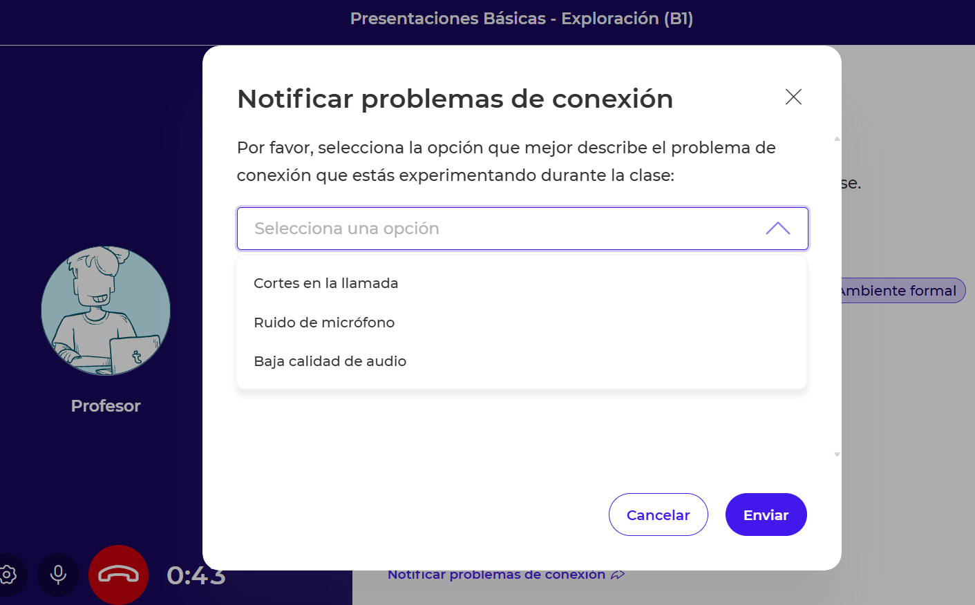 - Corte en la llamada: Puede ocurrir cuando la conexión no es adecuada para la sesión. Te recomendamos acceder al siguiente artículo y seguir las indicaciones para mejorar la conexión durante las clases de conversación.