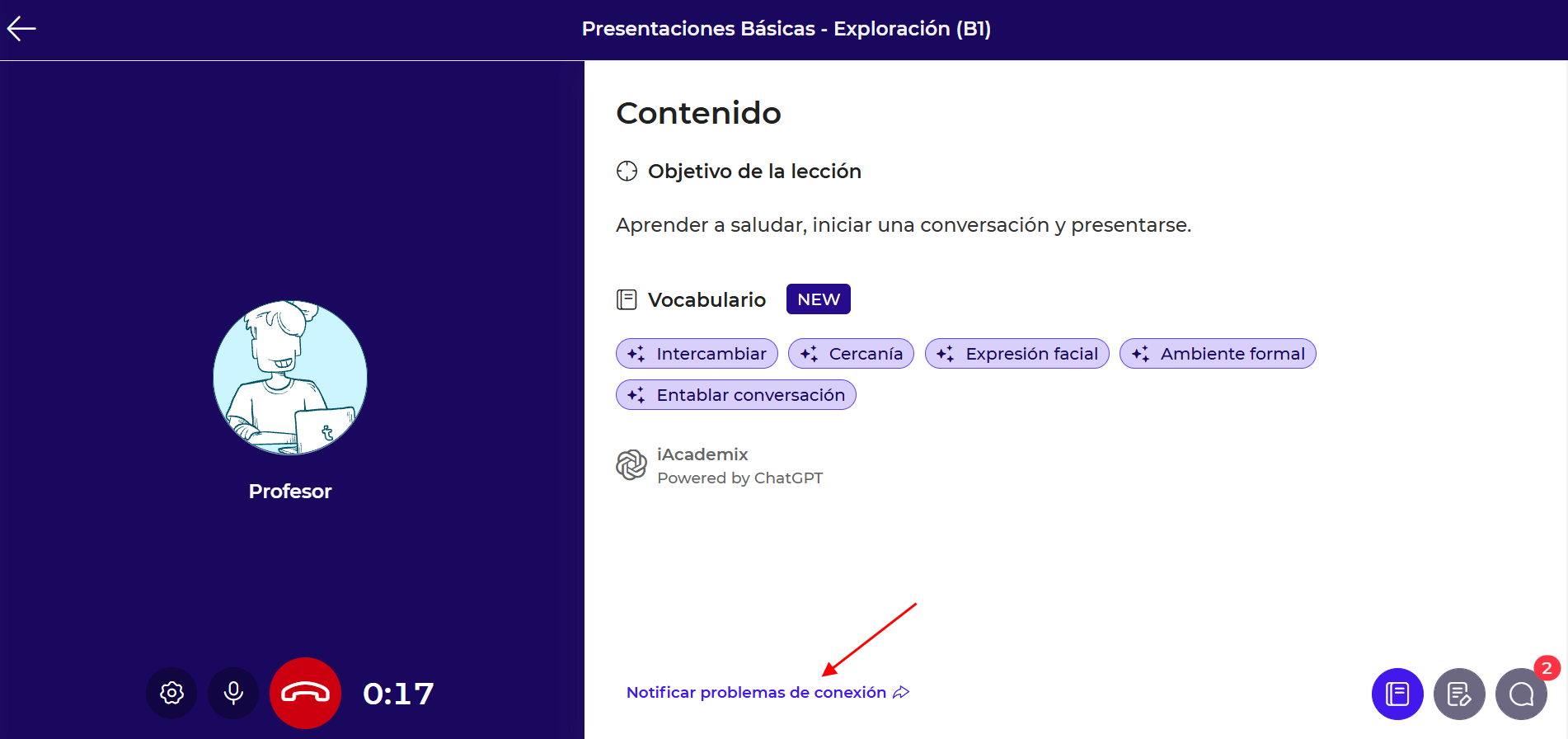 - Tras ingresar a la clase, tendrás a disposición el botón "Notificar problemas de conexión".