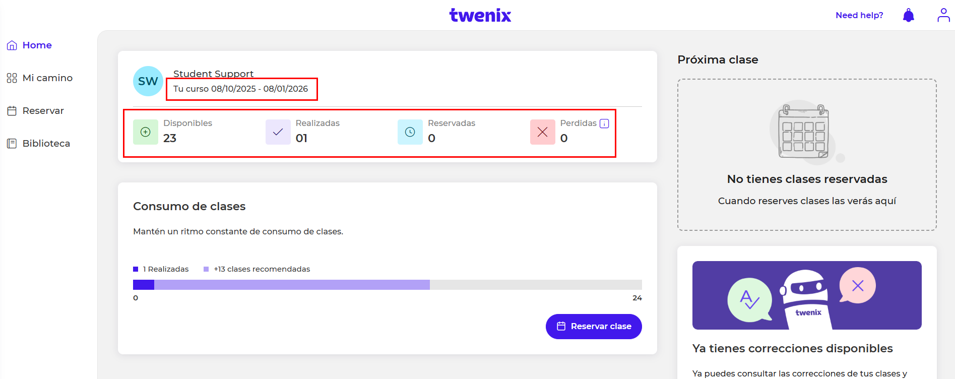 Además podrás verificar el número de las clases disponibles, reservadas, completadas y perdidas: