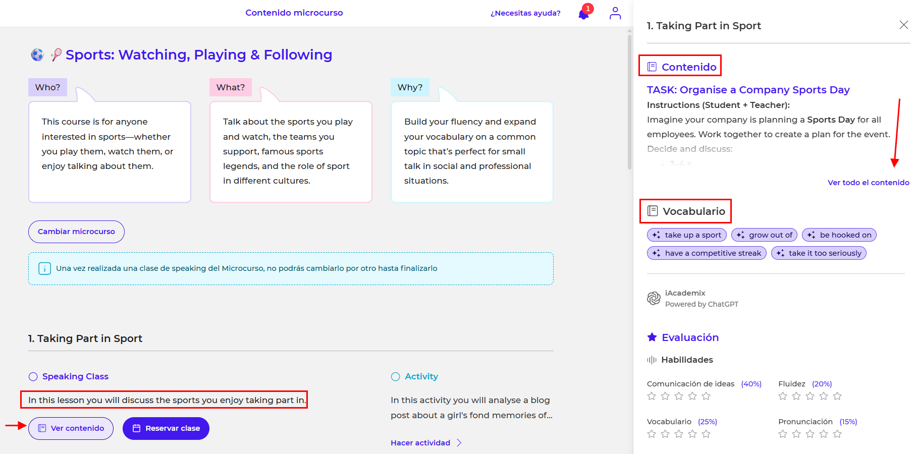 - Contenido: descripción del tema de la clase, esto te ayudará a entender el objeto de la conversación y de lo que se hablará con tu profesor.