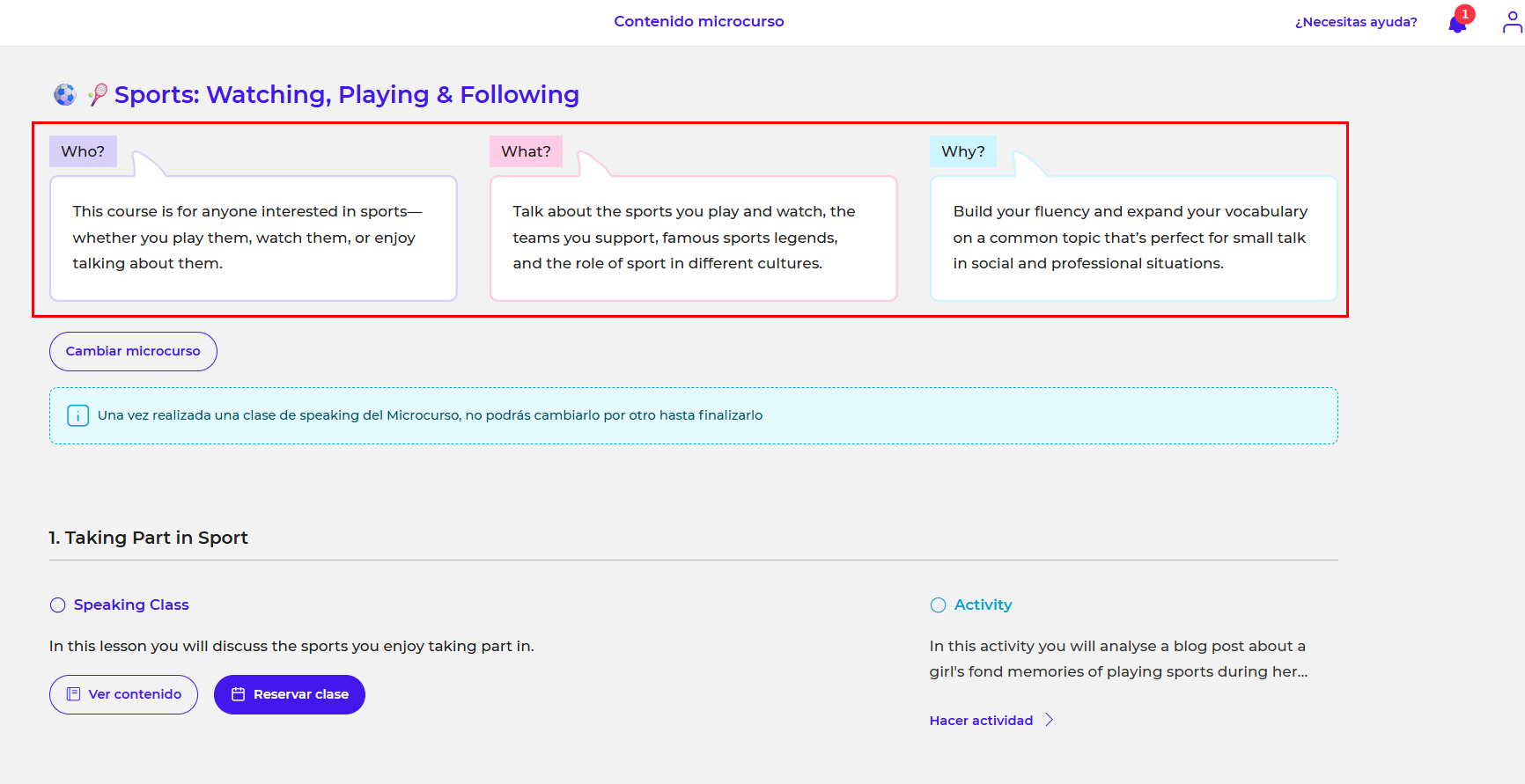 En el apartado "Who? - What? - Why?" del microcurso seleccionado, puedes leer el objetivo y propósito general del microcurso completo y todas sus 6 clases: