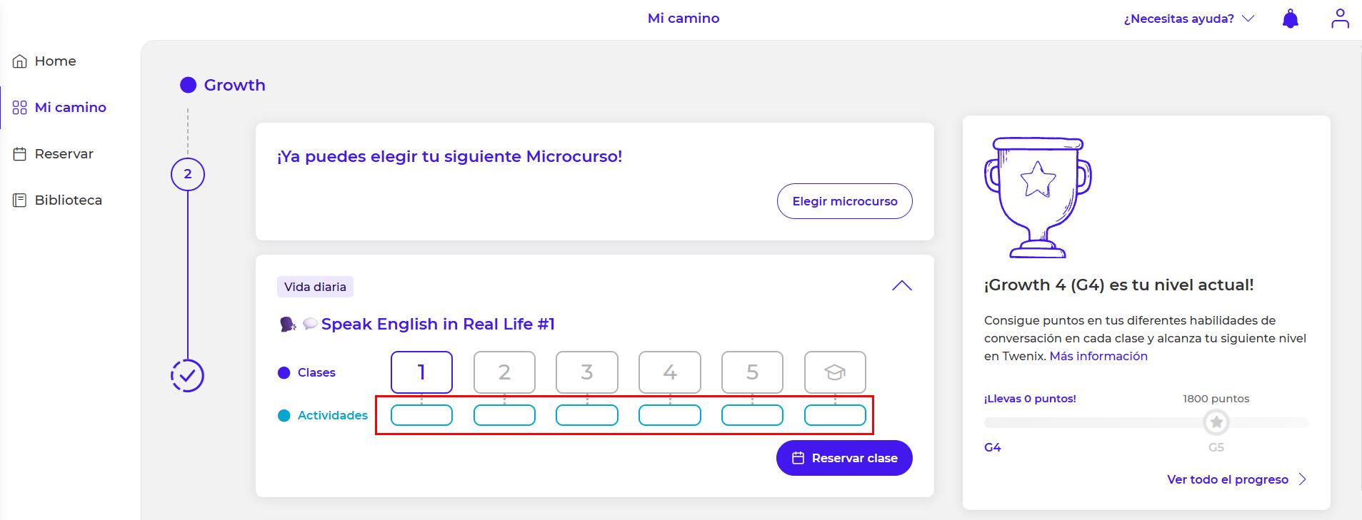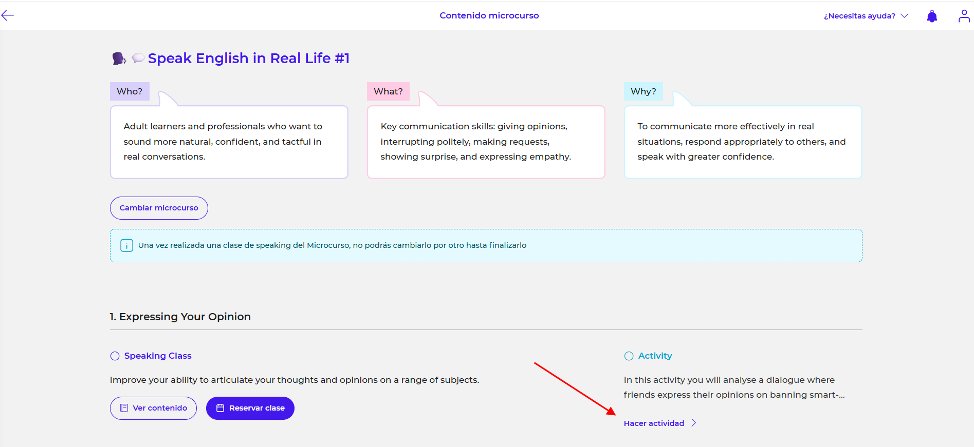 Puedes acceder a las actividades directamente desde el recuadro debajo de la casilla de cada lección, accediendo al contenido del microcurso y haciendo clic en "Hacer actividad":