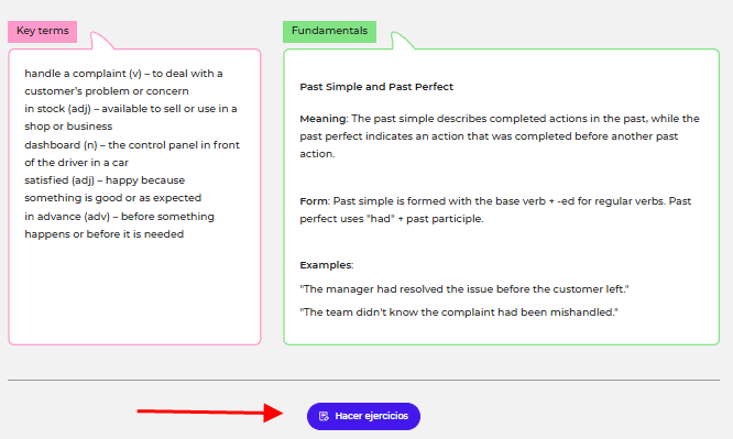 Después de examinar y estudiar el texto, se te dirigirá a un test final (clicando en "Hacer ejercicios"): 10 preguntas relacionadas con el contenido que deberás responder (un mini examen sobre el contenido que has leído).