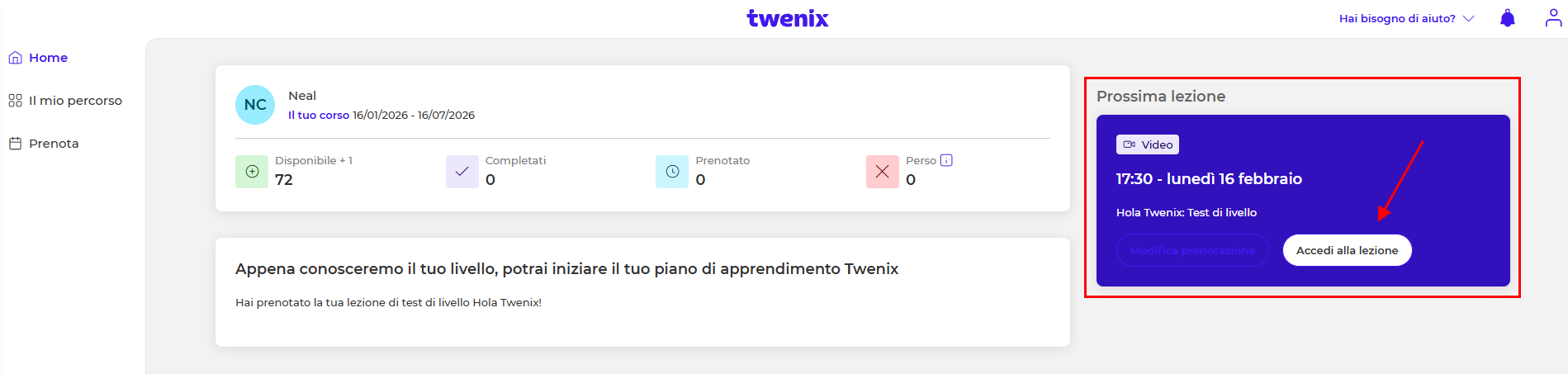 - Nella sezione "Home", troverai il pulsante "Accedi alla lezione" per entrare direttamente alla tua classe (sezione "Prossima lezione") nell'ora prestabilita.