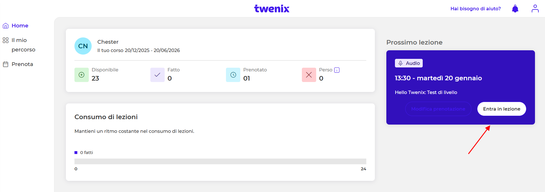 - Nella sezione "Home", troverai il pulsante per accedere direttamente alla tua classe ("Accedi alla lezione").
