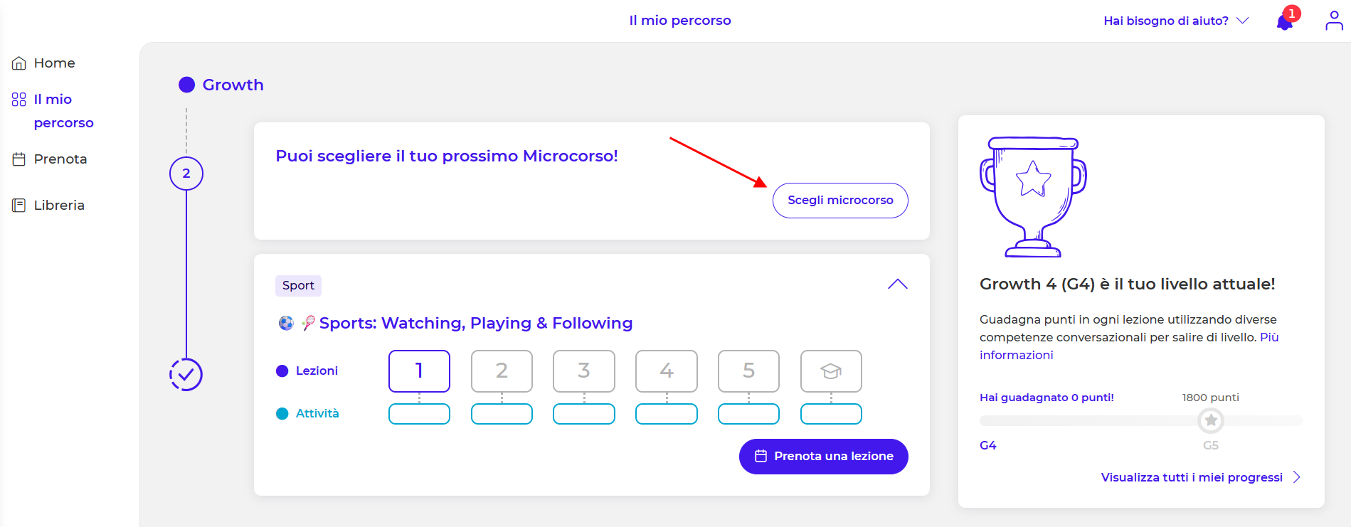I microcorsi che vedrai nel tuo pannello sono direttamente correlati al livello di difficoltà che il tuo insegnante ti ha assegnato durante la tua prima lezione.