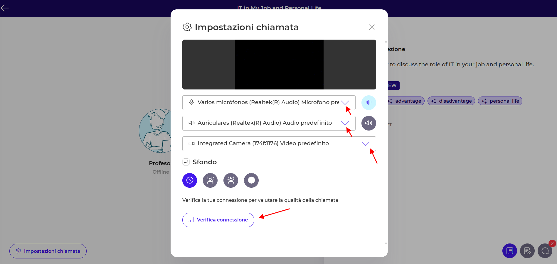 La piattaforma rileva automaticamente se hai le cuffie collegate o stai usando l’audio del dispositivo, ma ASSICURATI CHE L’OPZIONE SELEZIONATA SIA CORRETTA.