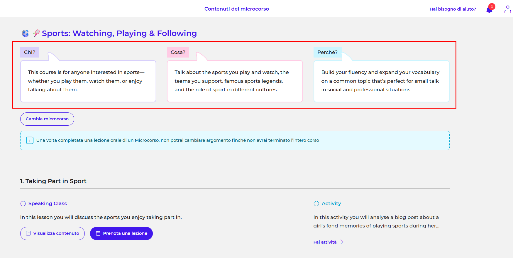 - Contenuto: Una descrizione dell'argomento della lezione che ti aiuterà a comprendere l'oggetto della conversazione e ciò di cui si parlerà con il tuo insegnante.
