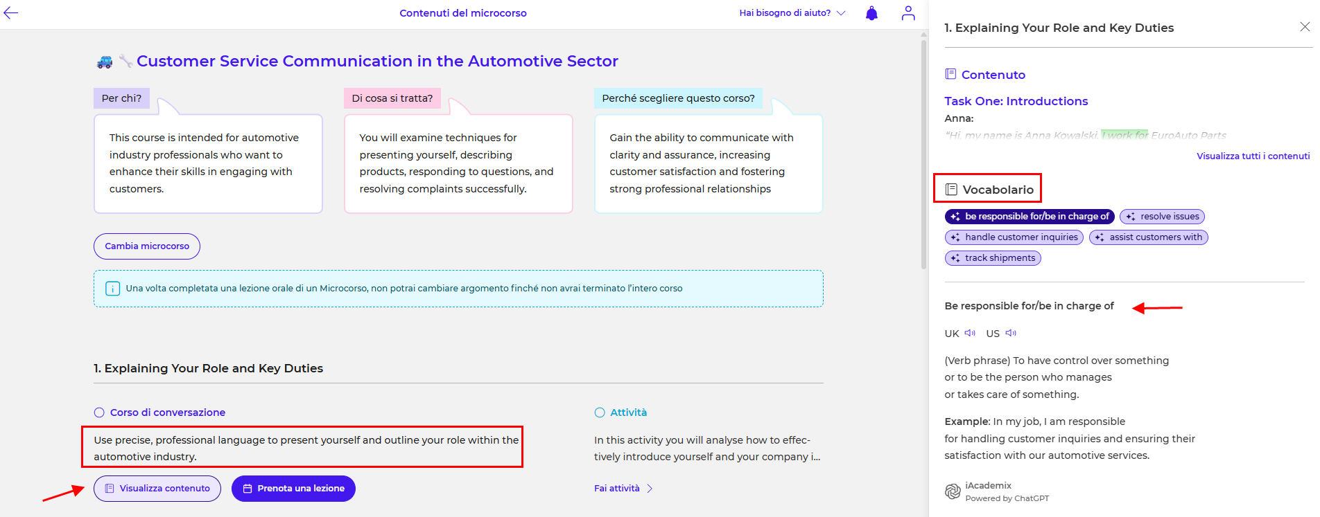 - Vocabolario: Ti verranno forniti 5 termini da studiare, che saranno il focus della lezione. Imparerai il loro significato e ti verrà chiesto di formulare frasi utilizzando quei termini.