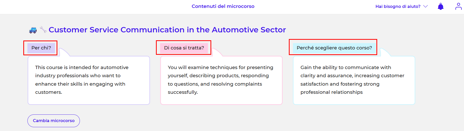 Nella sezione "Per chi? - Di cosa si tratta? - Perché scegliere questo corso?" del microcorso selezionato, puoi leggere l'obiettivo e lo scopo generale dell'intero microcorso e delle sue 6 lezioni: