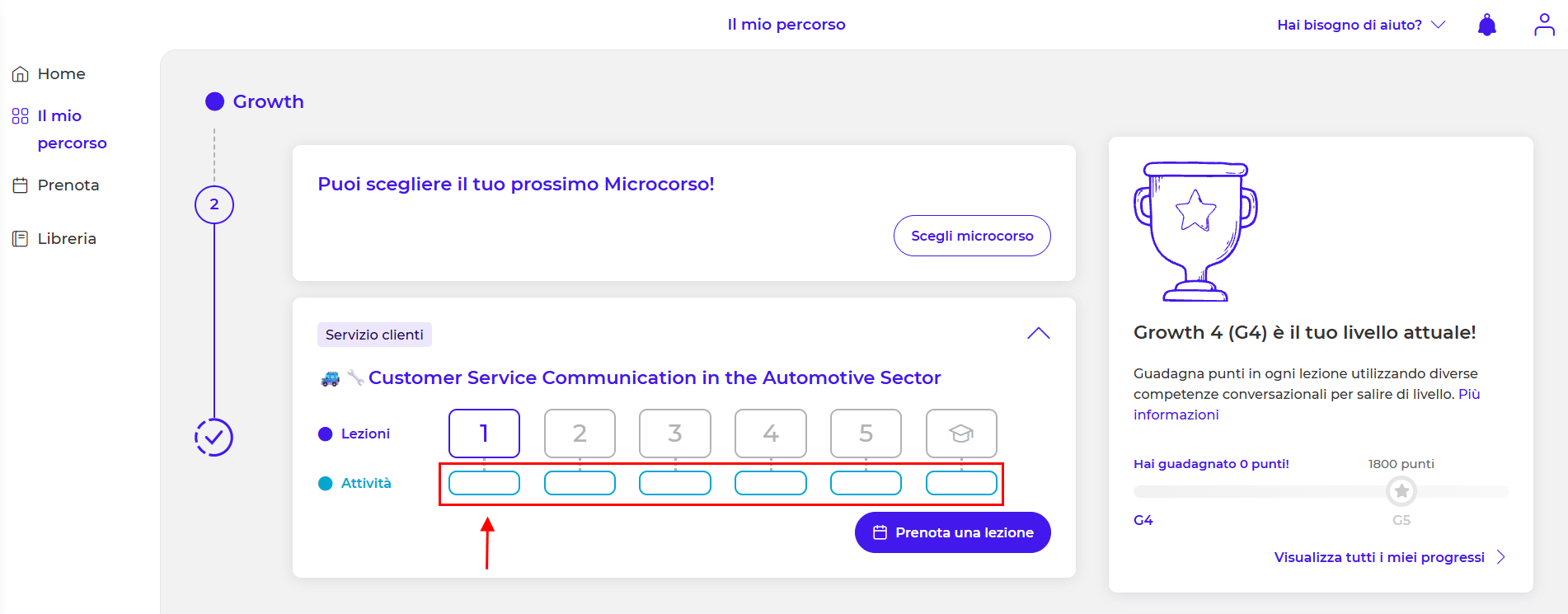 Puoi accedere alle attività direttamente dal riquadro sotto la casella di ogni lezione o accedendo all'interno del contenuto del microcorso, cliccando in "Fai attività":