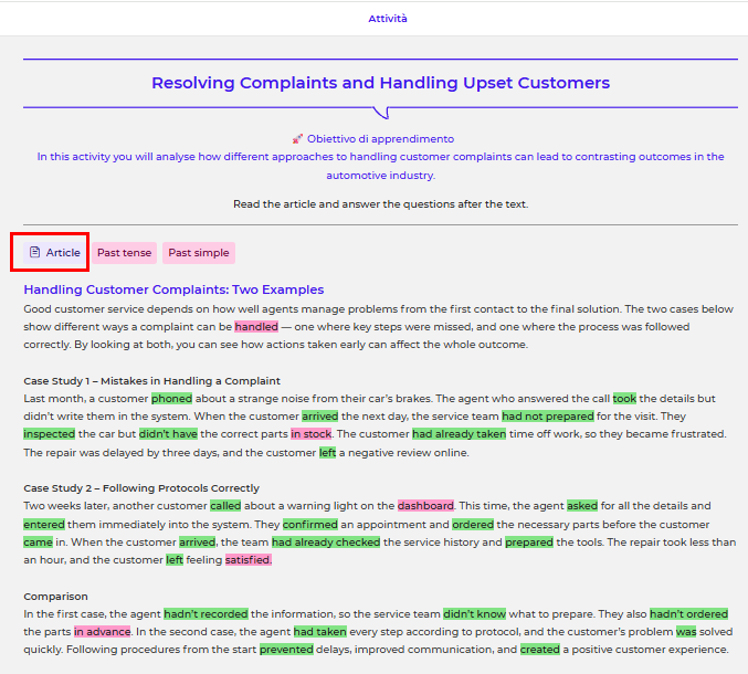Ad ogni microcorso vengono associate delle attività, esercizi grammaticali basati sulla tematica di ogni singola lezione di conversazione che si suddividono in articoli e podcasts.