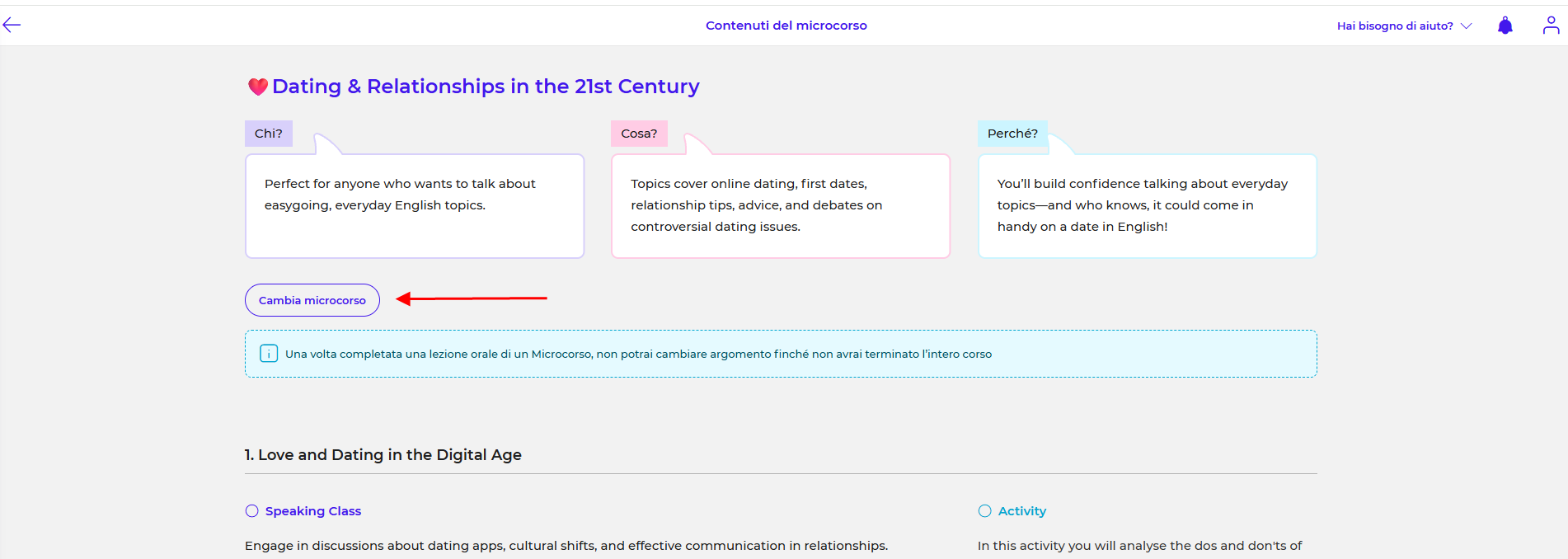 Cambia il secondo microcorso ("Speak English in Real Life #2") con quello che hai precedentemente svincolato e che desideri iniziare per primo ("Dating & Relationships in the 21st Century"):
