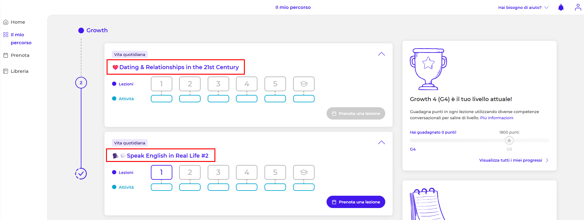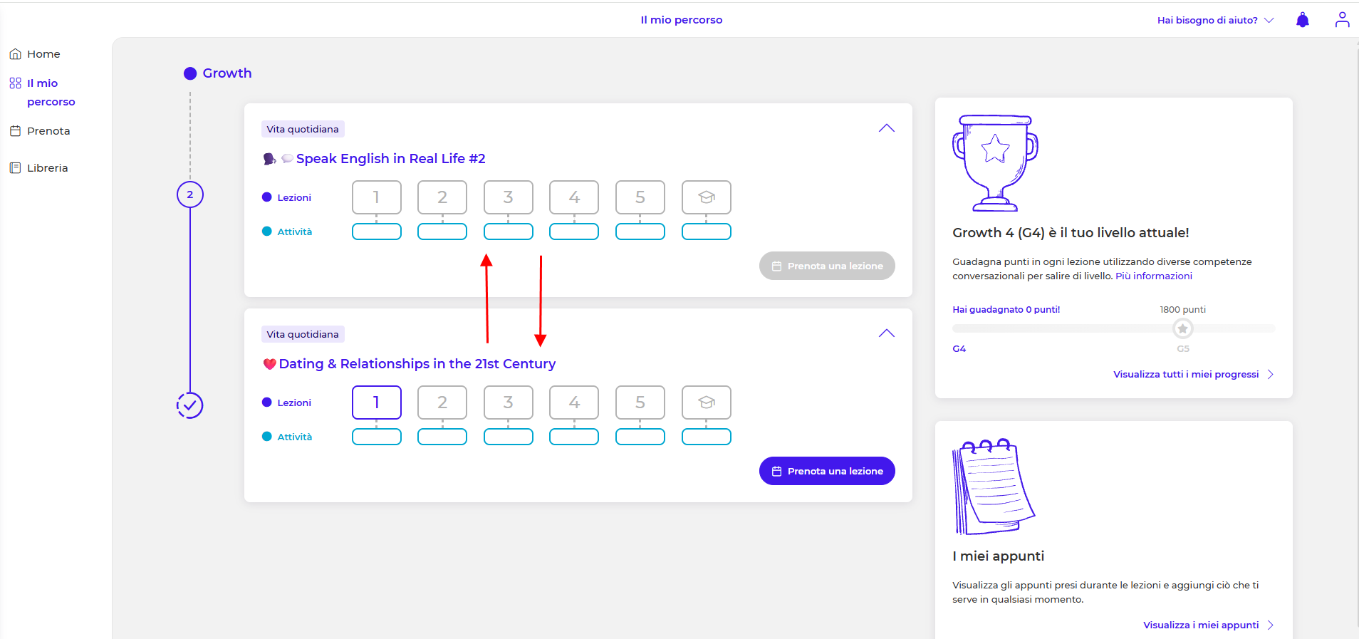 Se hai selezionato 2 microcorsi e desideri cambiare l'ordine di inizio (cominciando con l'ultimo scelto), segui queste istruzioni (ricorda che questa azione può essere completata solo se non hai partecipato o completato nessuna lezione di conversazione e nessuna attività).