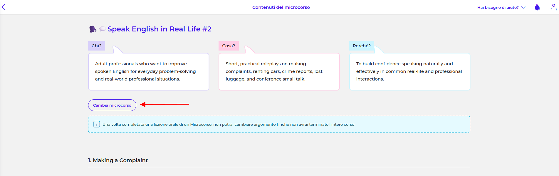 Ora, cambia il microcorso scelto casualmente con quello che avevi selezionato in precedenza, "Speak English in Real Life #2" (o quello che desideri).