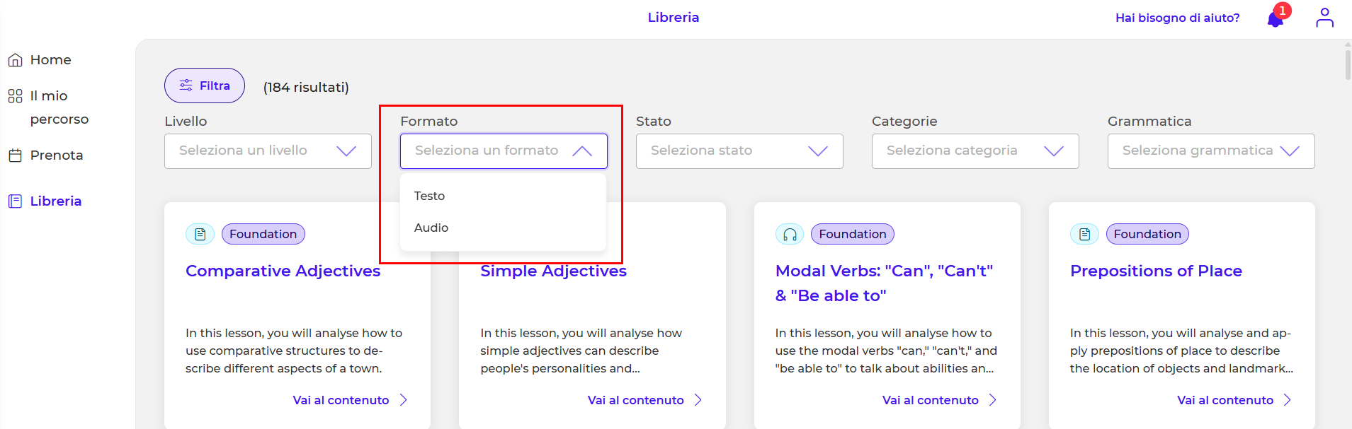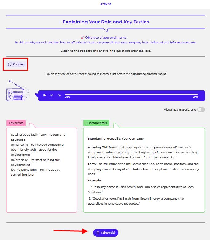 - Formato> Puoi scegliere se completare gli esercizi in formato testo (testo da leggere) o formato audio (podcast da ascoltare):