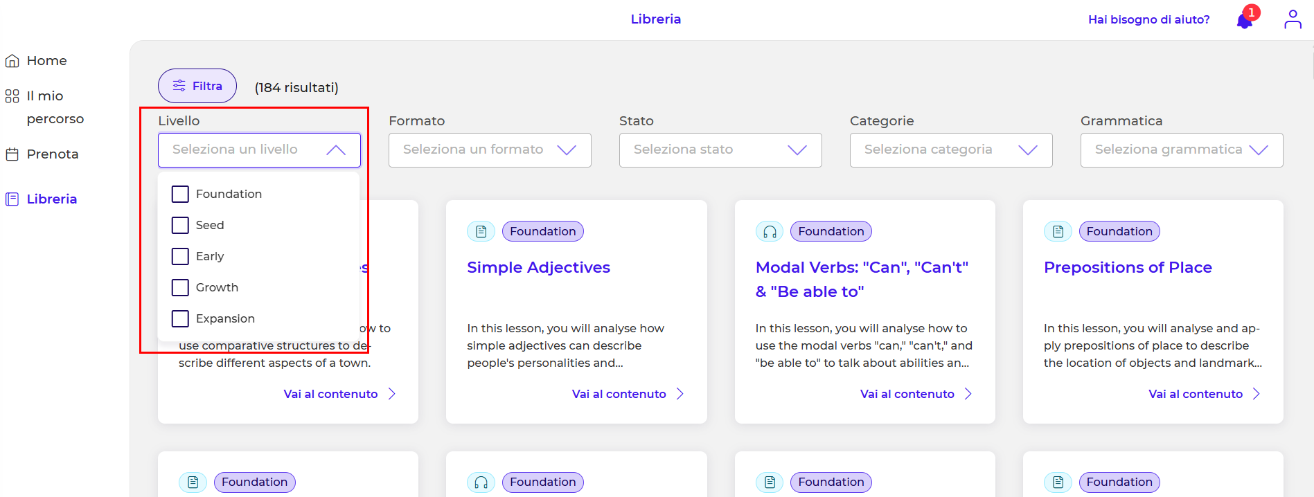 - Livello > Questo filtro ti permette di selezionare lo stage che desideri sviluppare e ti verranno forniti esercizi associati al livello scelto: