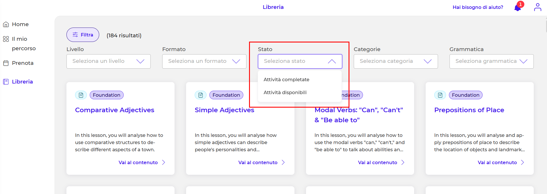 - Stato > Questo filtro ti permette di vedere gli esercizi già completati e gli esercizi disponibili (non ancora completati):