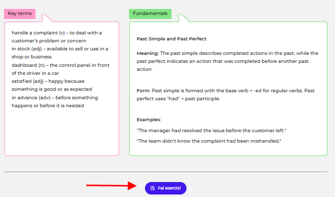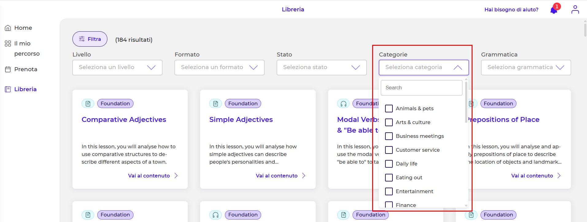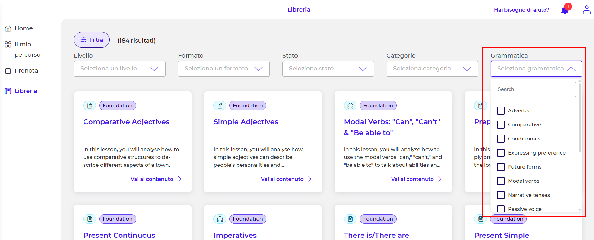 - Grammatica > Puoi filtrare gli esercizi in base alla parte grammaticale che desideri studiare (avverbi, comparativi, condizionali, ecc.):