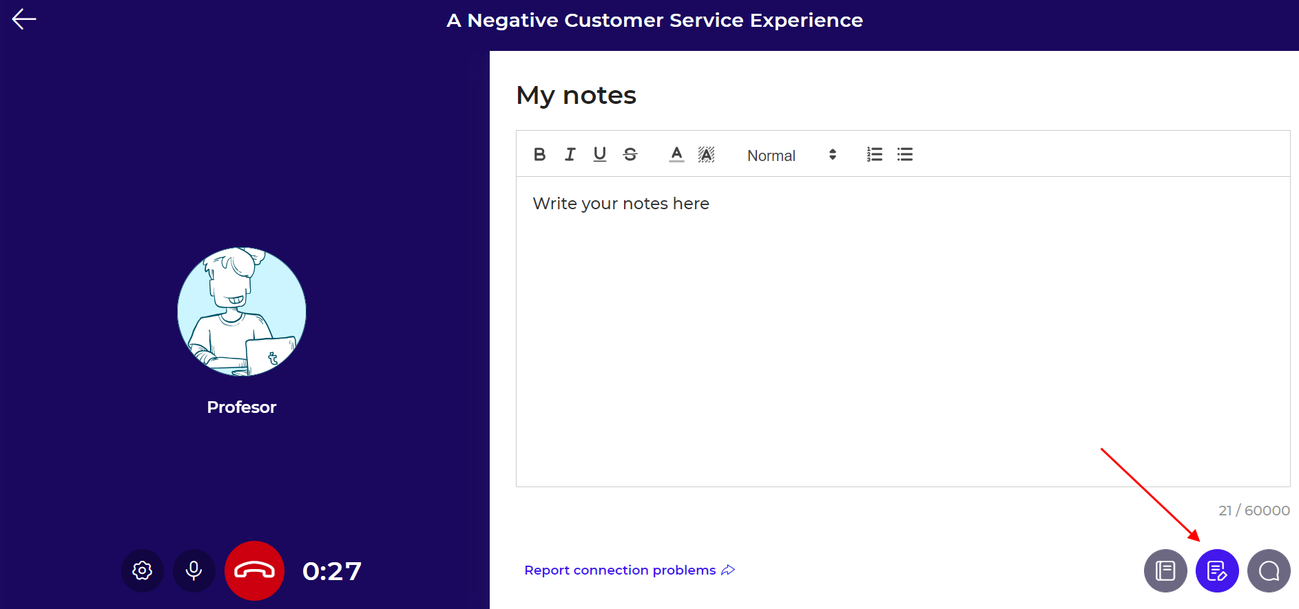 Ricordati che puoi copiare i messaggi dell'insegnanti e appuntare tutte le tue note nella sezione 'My notes' cliccando nel riquadro centrale in basso a destra: